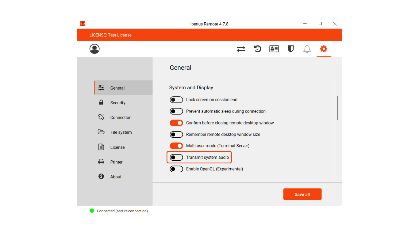 Con Iperius Remote, la trasmissione audio permette di ascoltare in tempo reale i suoni del sistema remoto durante una sessione di controllo remoto, migliorando l’esperienza di assistenza tecnica, formazione e collaborazione a distanza.